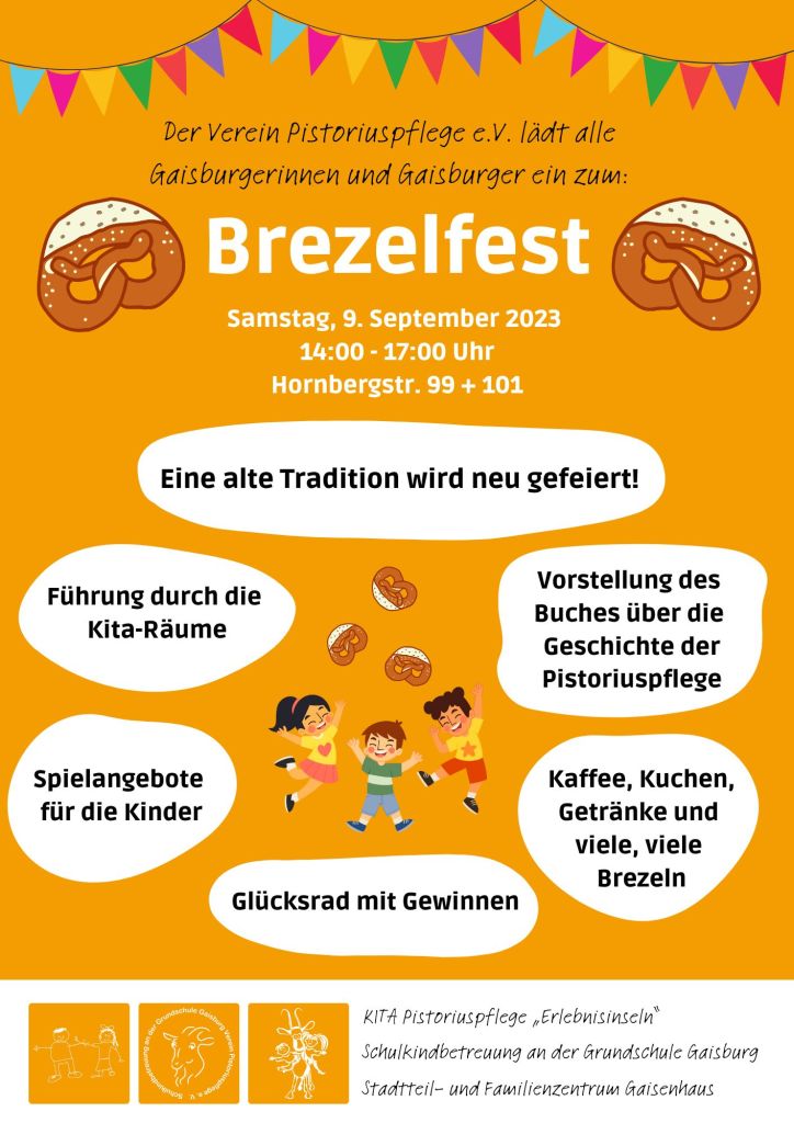 Gemeinsam mit den 3 Einrichtungen feiert unser Trägerverein Pistoriuspflege e.V. am 9.9. das sogenannte „Brezelfest“. Dazu sind alle Gaisburger Anwohnerinnen und Anwohner, sowie all unsere Ehrenamtlichen und unsere Teilnehmer*innen herzlich eingeladen. Das Fest soll eine alte Tradition wieder aufleben lassen, es gibt Kuchen und Kaffee und ein buntes Programm für die Kinder. Interessierte können sowohl unsere Räume besichtigen, als auch an einer Führung durch die Kita-Räume teilnehmen.