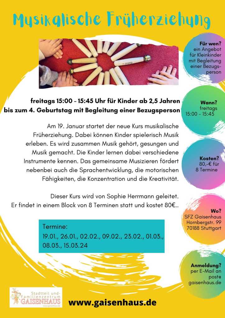 musikalische Früherziehung freitags von 15:00 -15:45 Uhr Januar 16, 2024Juli 12, 2024 gaisenhaus Ähnliche Beiträge