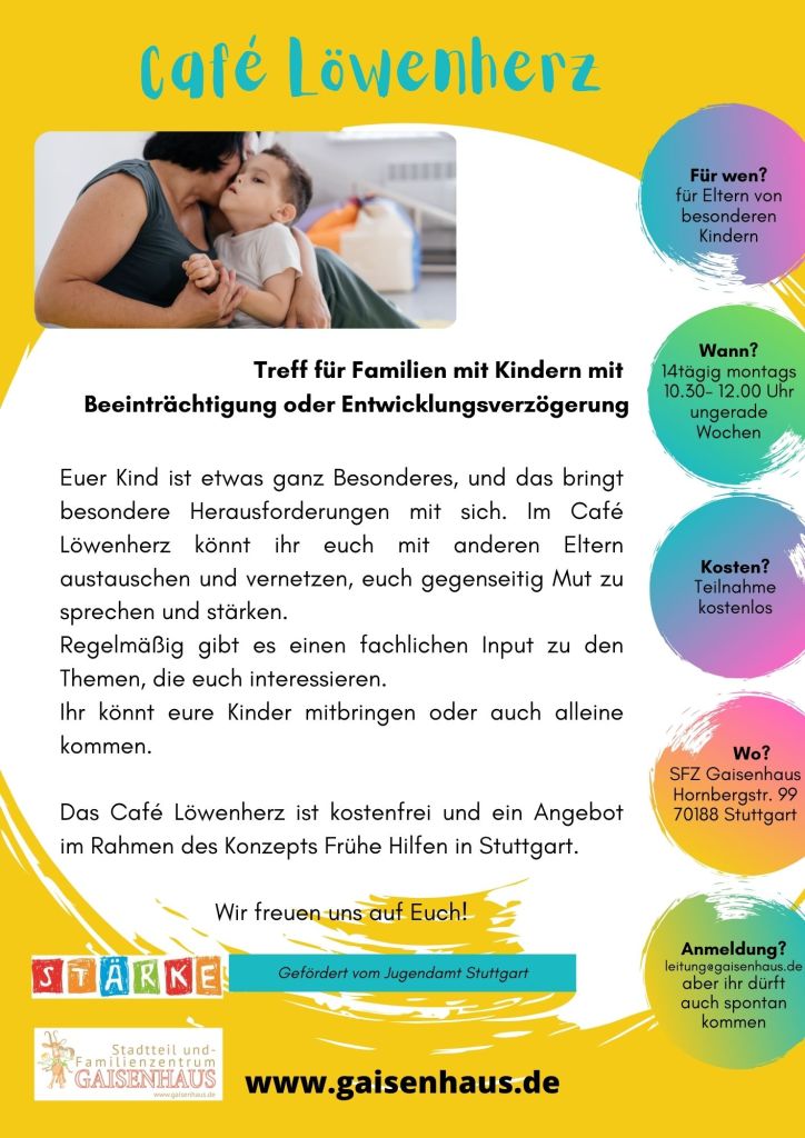 Café Löwenherz – offener Treff für Familien mit Kindern mit Entwicklungsverzögerung oder Beeinträchtigung. 14tägig montags, 10.30 bis 12.00 Uhr ab 12.02.24