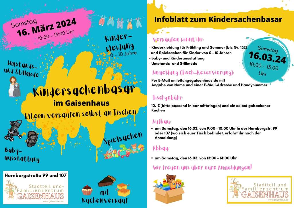 Unser nächster Kindersachenbasar im Frühjahr findet am 16.03.24 von 10-13 Uhr mit Verkauf an Tischen statt. Tischreservierung unter: leitung@gaisenhaus.de