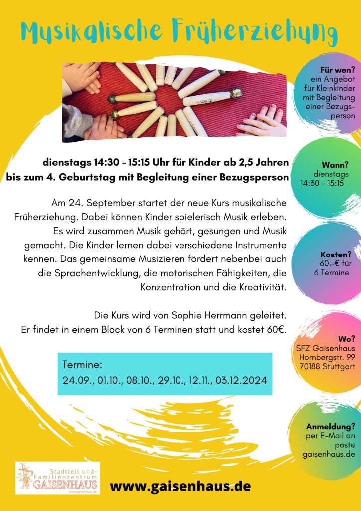 Musikalische Früherziehung September 21, 2024 gaisenhaus Der neue Musikkurs für Kinder ab 2,5 Jahren mit Sophie startet am Dienstag, den 24.09., meldet euch gerne noch dafür an! Ähnliche Beiträge