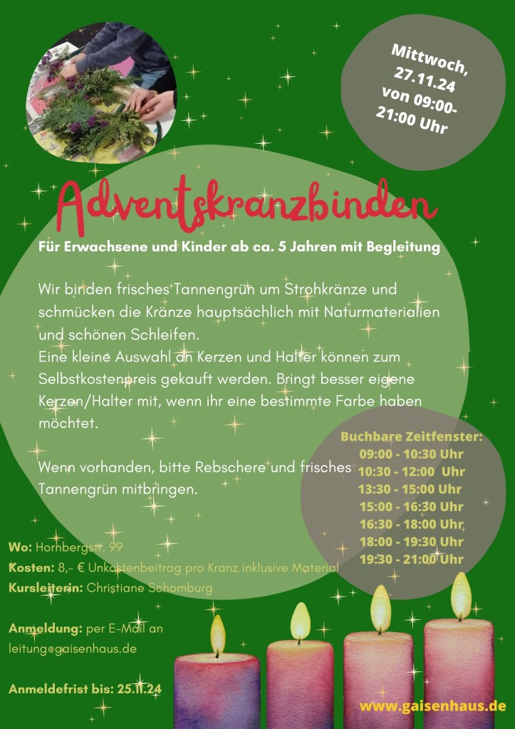 Am Mittwoch, den 27.11.24 binden wir wieder gemeinsam Adventskränze, Kinder ab 5 Jahren können schon selbst mitmachen, müssen aber eine Begleitperson dabeihaben. Kleinere Geschwister/Babys dürfen auch mitgebracht werden und können in unserem Spielbereich spielen. Bitte gebt bei der Anmeldung bis zum 25.11. an, in welchen Zeitraum ihr kommen möchtet.