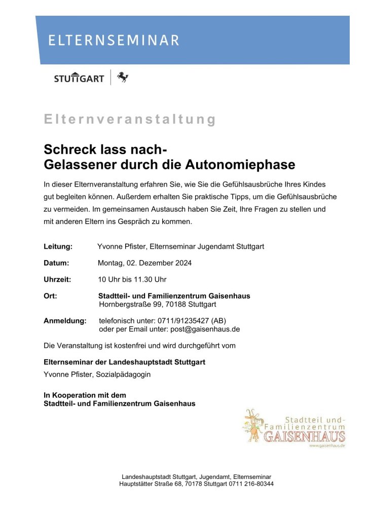 Meldet euch gerne an zum nächsten Elternseminar mit Yvonne Pfister vom Städtischen Elternseminar: Montag, 02.12.24 10.00 bis 11.30 Uhr in der 107!