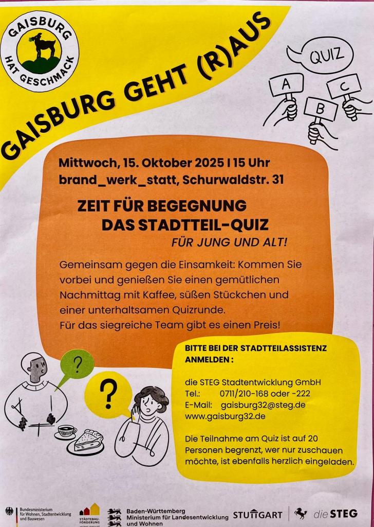 Am Mittwoch, 15. Oktober 2025 von 15:00 – ca. 18:00 Uhr wollen wir gemeinsam am Stadtteil-Quiz teilnehmen. Ein gemütlicher Nachmittag mit Kaffee, süßen Stückchen und einer unterhaltsamen Quizrunde in der Brand Werkstatt.
