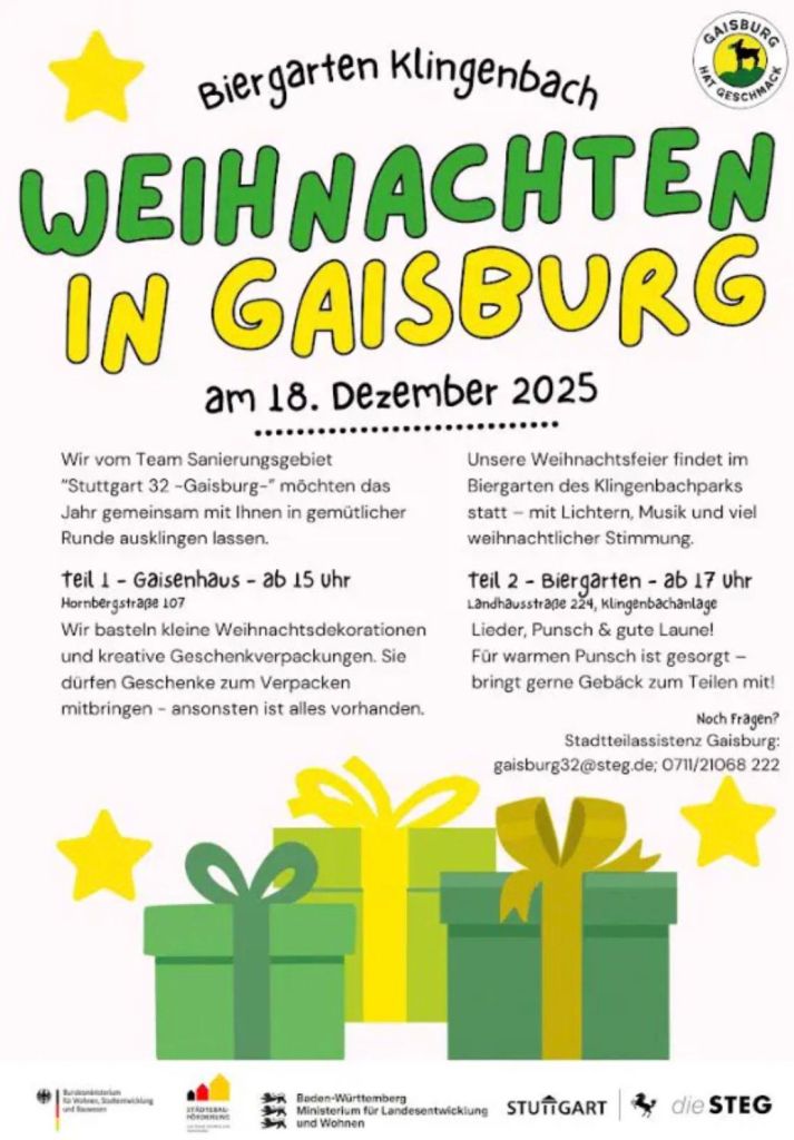 An diesem Donnerstag, 18. Dezember, wird im Sanierungsgebiet Gaisburg Weihnachten gefeiert. Das Team des Stadtplanungsamts lädt ein: