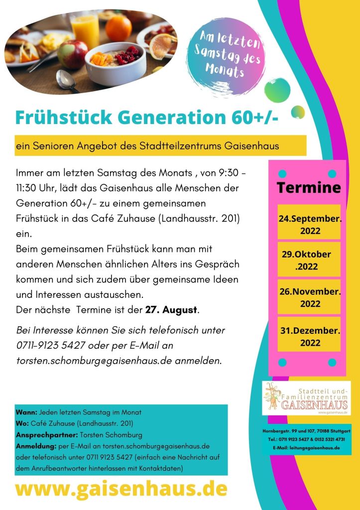 Jeweils am letzten Samstag des Monats laden wir von 9:30 – 11:30 Uhr alle Menschen 60+/- ganz herzlich zum „Frühstück 60+/-“ ein. Dieses findet i. d. R. im Café Zuhause (Landhausstr. 201) statt. Beim gemeinsamen Frühstück kann man sich gegenseitig kennenlernen und – bei Interesse – gerne weitere Aktivitäten (z. B. einen Spielnachmittag oder Besuche von Kulturveranstaltungen) planen. Die nächsten Termine sind: 26. November und 31. Dezember.