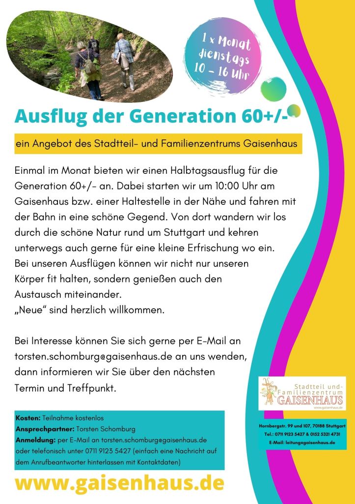 Genau das wollen wir in den Mittelpunkt unseres Angebotes für die Generation 60 +/- stellen, die Freude und das gemeinsame Erleben. Im März 2021 starteten wir – aufgrund der Pandemie zunächst lediglich im Freien – mit Spaziergängen bzw. ca. zweistündigen Wanderungen rund um Gaisburg. Weitere Angebote kamen hinzu und mehr wird folgen.