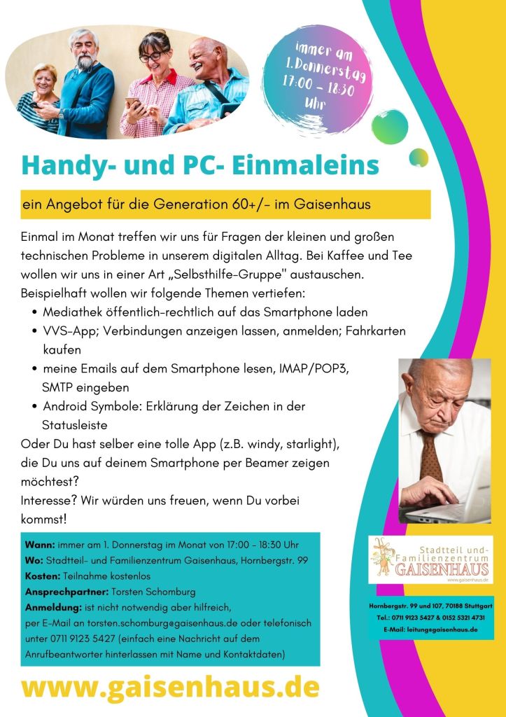Wir freuen uns, dass wir ab November ein neues Angebot für die Generation 60+/- anbieten können. Immer am 1. Donnerstag im Monat kann man mit seinem Smartphone oder Laptop kommen und sich erklären lassen, wie man das Gerät richtig bedient, was man alles damit machen kann oder auch, was man zusätzlich noch für Apps bzw. Programme darauf installieren kann.