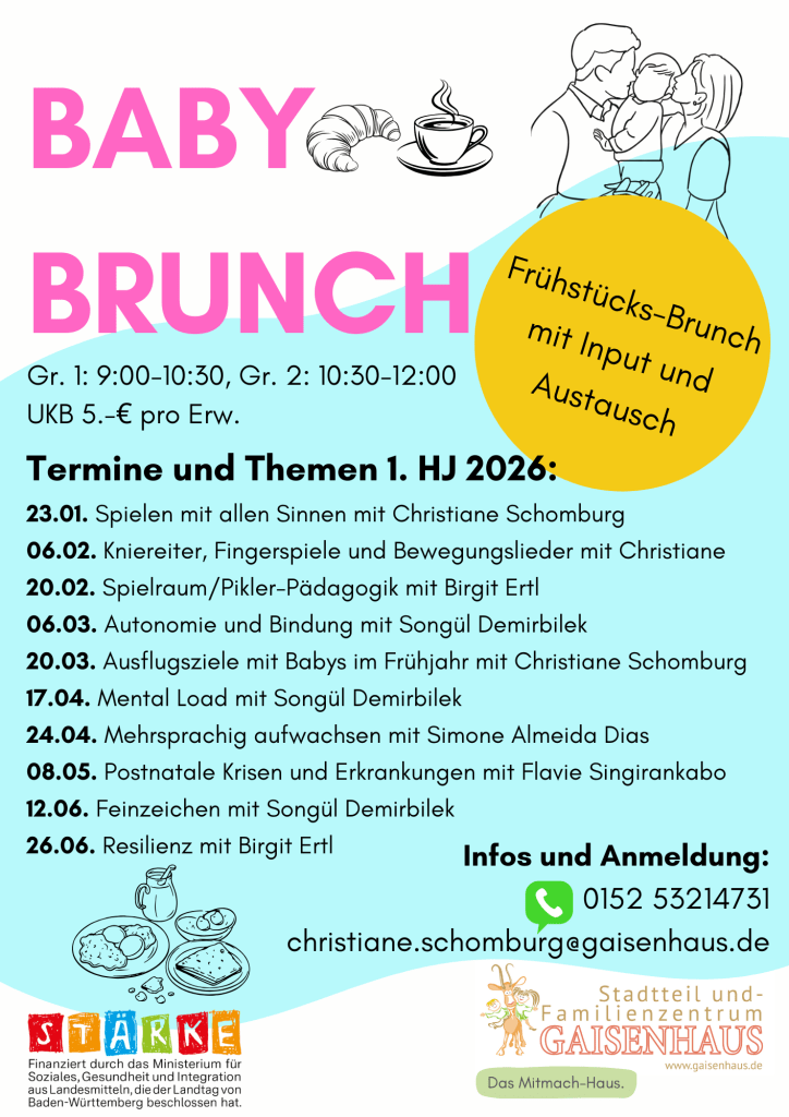 Baby Brunch im Gaisenhaus Anmeldung ← ZurückDeine Anmeldung wurde gesendet Wir geben dir Bescheid Name(erforderlich) E-Mail(erforderlich) Alter/Name des Kindes; Datum und Uhrzeit (9:00-10:30 oder 10:30-12:00 ) des gewünschten Termins Anmeldung sendenEinreichungsformular Δ