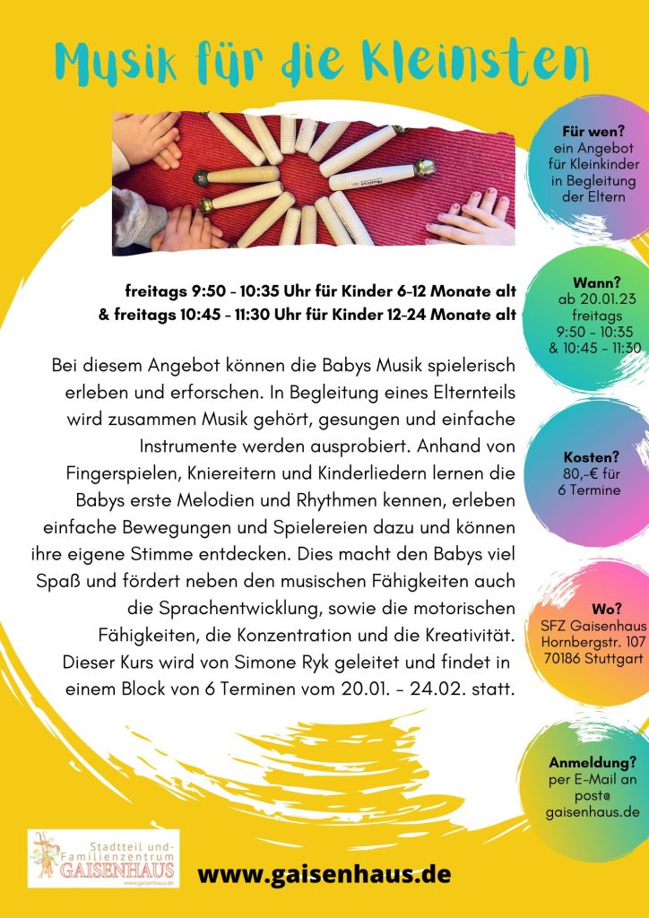Der Kursstart musste leider verschoben werden auf Januar 2023. Dann bietet das Gaisenhaus auch musikalische Früherziehung für Kinder im Alter von 1,5 bis 5 Jahren an. Beide Gruppen sind vorläufig voll! Ihr könnt Euch aber immer noch gerne auf die Warteliste setzten lassen.