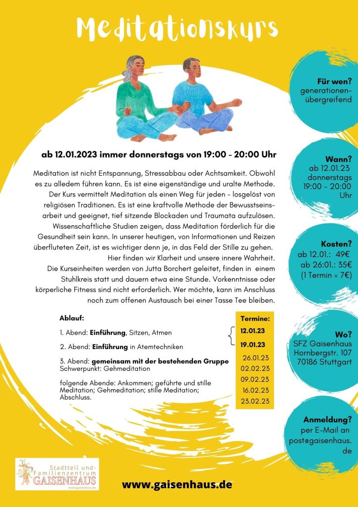 Unser neuestes Angebot ist ein Meditationskurs, der am 20. Oktober mit einem Block aus 8 Terminen starten wird. Ob jung oder alt, Mann oder Frau oder divers, wir freuen uns über alle, die Meditation einmal ausprobieren möchten! In der heutigen stressigen Zeit ist diese Auszeit für Geist und Seele ein wohltuendes Geschenk an sich selbst!