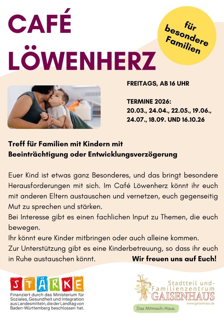 Café Löwenherz – offener Treff für Familien mit Kindern mit Entwicklungsverzögerung oder Beeinträchtigung. Du möchtest andere Eltern von Kindern mit Beeinträchtigung kennenlernen und dich austauschen? Dann melde dich bei uns!