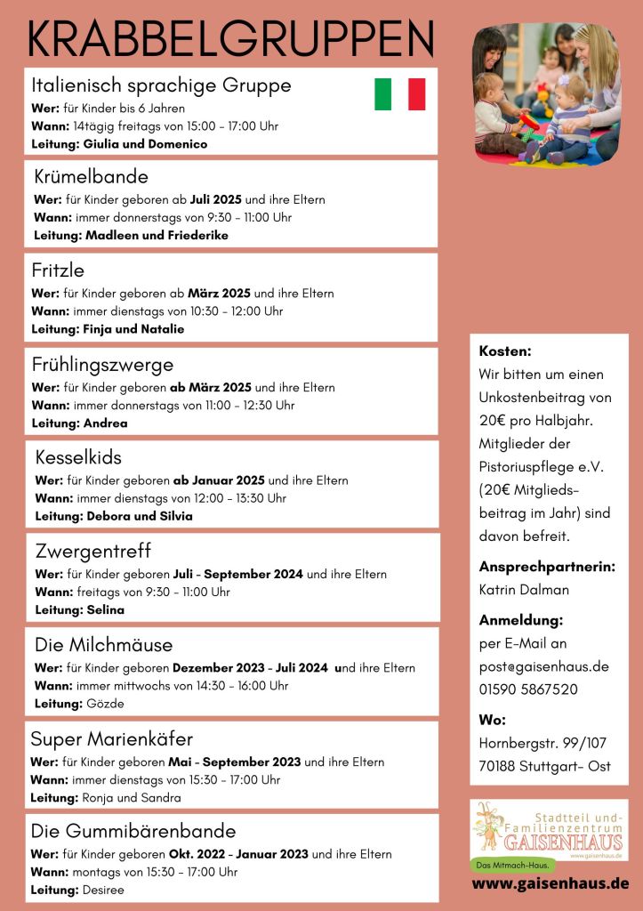 Hier könnt ihr in einer festen Gruppe andere Familien mit Kindern im gleichen Alter kennenlernen und euch austauschen. Unsere Krabbelgruppen sind selbst verwaltet. Es gibt keine pädagogische Leitung oder ein Programm. Ihr selber entscheidet, wie ihr eure Gruppe gestalten möchtet