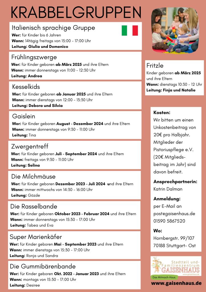 Krabbelgruppen Bitte freie Plätze hier unten oder unter leitung@gaisenhaus.de anfragen. Danke! ZurückDeine Nachricht wurde gesendet Name(erforderlich) Achtung Email(erforderlich) Achtung Weitere Details (Name der Gruppe/Alter und Name des Kinds) Achtung Warnung! Anmeldung sendenEinreichungsformular Δ