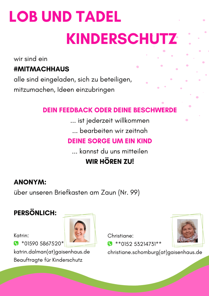 Von 2004-2018 wurde das Familienzentrum Gaisenhaus rein ehrenamtlich getragen. Seit Juli 2018 wird eine hauptamtliche Stelle durch die Stadt gefördert, die 2020 nochmals erhöht wurde. Derzeit arbeiten Christiane Schomburg als administrative Leitung, Katrin Dalman als pädagogische Leitung, Rieke Hauber als Zuständige für Social Media und Unterstützung in der Verwaltung und Torsten Schomburg als Koordinator von Angeboten für Väter und für die Generation 60+/- und Zuständiger für die Homepage sowie Facility Manager im Leitungs-Team. Unterstützt werden sie durch viele ehrenamtlich Aktive, beispielsweise die Gastgeber:innen im Offenen Treff, die Betreuer:innen im Minikindergarten, die Krabbelgruppen-Leiter:innen sowie die Leiter:innen der Kreativangebote und weiterer Kurse sowie Einzelveranstaltungen. Darüber hinaus bieten selbständig Tätige Kurse und Workshops bei uns an.