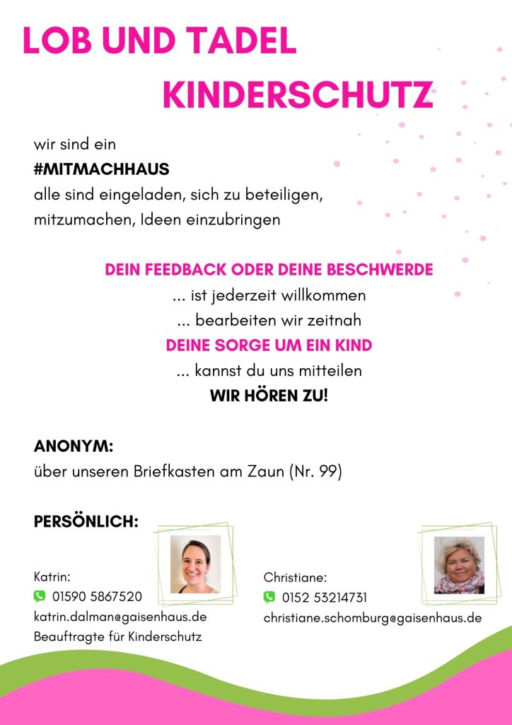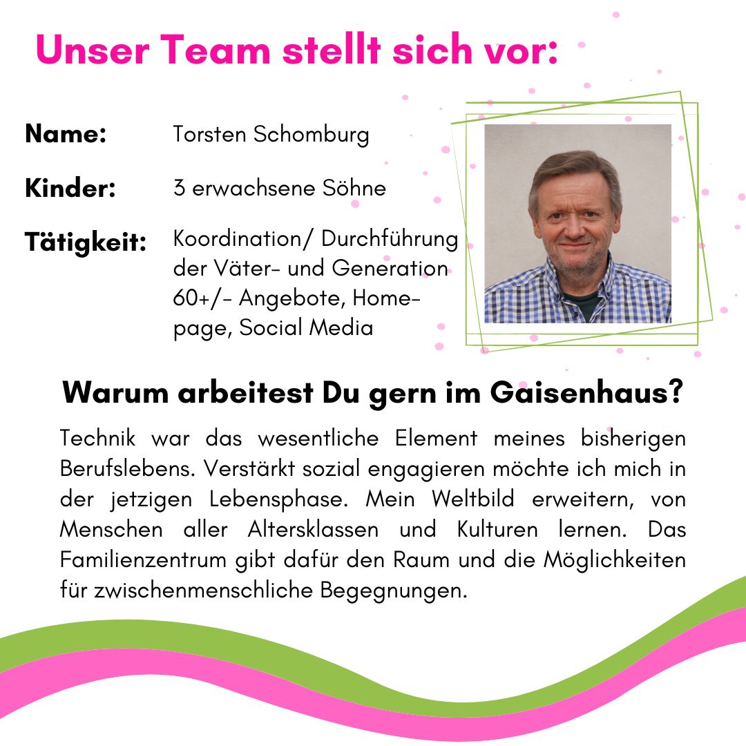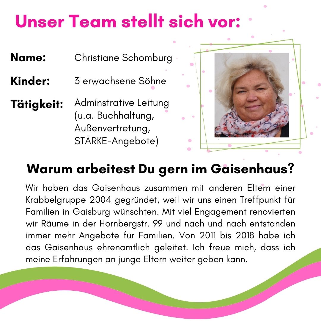 Von 2004-2018 wurde das Familienzentrum Gaisenhaus rein ehrenamtlich getragen. Seit Juli 2018 wird eine hauptamtliche Stelle durch die Stadt gefördert, die 2020 nochmals erhöht wurde. Derzeit arbeiten Christiane Schomburg als administrative Leitung, Katrin Dalman als pädagogische Leitung, Rieke Hauber als Zuständige für Social Media und Unterstützung in der Verwaltung und Torsten Schomburg als Koordinator von Angeboten für Väter und für die Generation 60+/- und Zuständiger für die Homepage sowie Facility Manager im Leitungs-Team. Unterstützt werden sie durch viele ehrenamtlich Aktive, beispielsweise die Gastgeber:innen im Offenen Treff, die Betreuer:innen im Minikindergarten, die Krabbelgruppen-Leiter:innen sowie die Leiter:innen der Kreativangebote und weiterer Kurse sowie Einzelveranstaltungen. Darüber hinaus bieten selbständig Tätige Kurse und Workshops bei uns an.